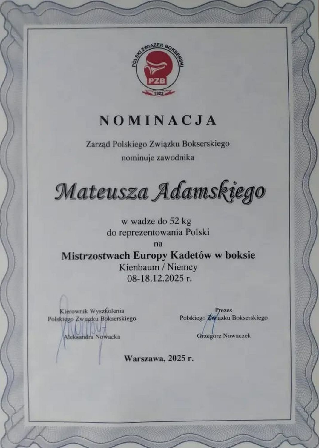 Natomiast w grudniu Mateusz reprezentował Polskę w Mistrzostwach Europy Kadetów, które odbyły się w niemieckim Kienbaum. Zawody stały na bardzo wysokim poziomie sportowym i były areną wielu emocjonujących pojedynków. Mateusz już w pierwszej walce musiał sprostać trudnemu i ofensywnemu zawodnikowi z Francji. Pokazując doskonałe przygotowanie i sportową determinację, pokonał Yanissa Damiens-Maillie’a, potwierdzając, że jest w świetnej formie.